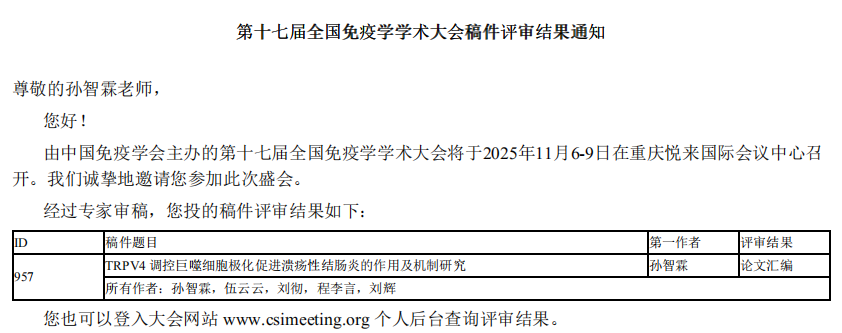 通过与各界专家的深入探讨,参会师生更加全面地了解研究领域最新前沿动态,拓宽了学术视野,获得了科学研究的新启发。尤其在溃疡性结肠炎、银屑病机制等方面受到启发,为后续课题设计与实验开展积累了重要参考。此外,我院本科生孙智霖撰写的“TRPV4调控巨噬细胞极化促进溃疡性结肠炎的作用及机制研究”被会议论文集收录,体现出学院在学生科研创新能力培养方面的成果。未来,学院将继续鼓励师生参与高水平学术会议,拓展合作网络,逐步提升学科建设水平和科研实力,推动医学教育高质量发展。(伍云云/文、供图)